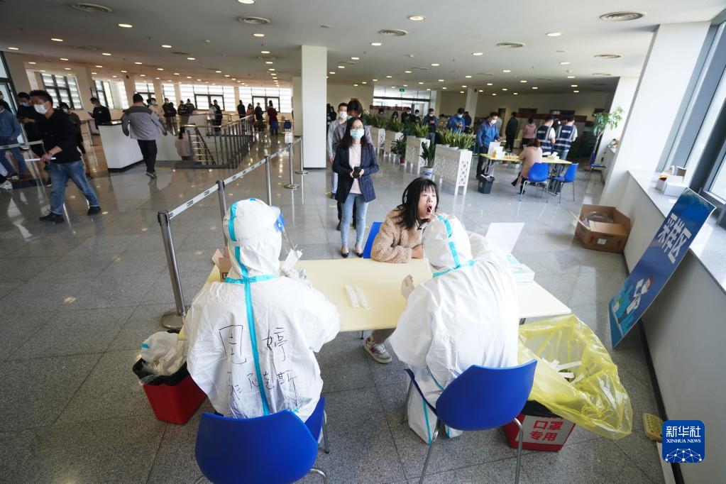 在位于江宁开发区的菲尼克斯电气中国公司,员工们在接受核酸采样(4月2日摄)。