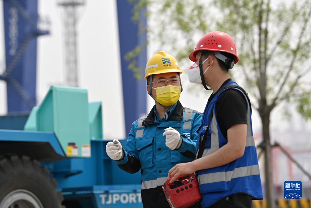 成卫东(左)和同事在天津港北疆港区C段智能化集装箱码头调试“水平运输机器人”(4月29日摄)。