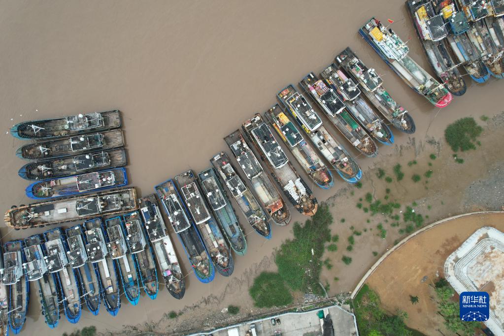 4月30日,休渔的渔船停靠在浙江省瑞安市东山渔港码头(无人机照片)。