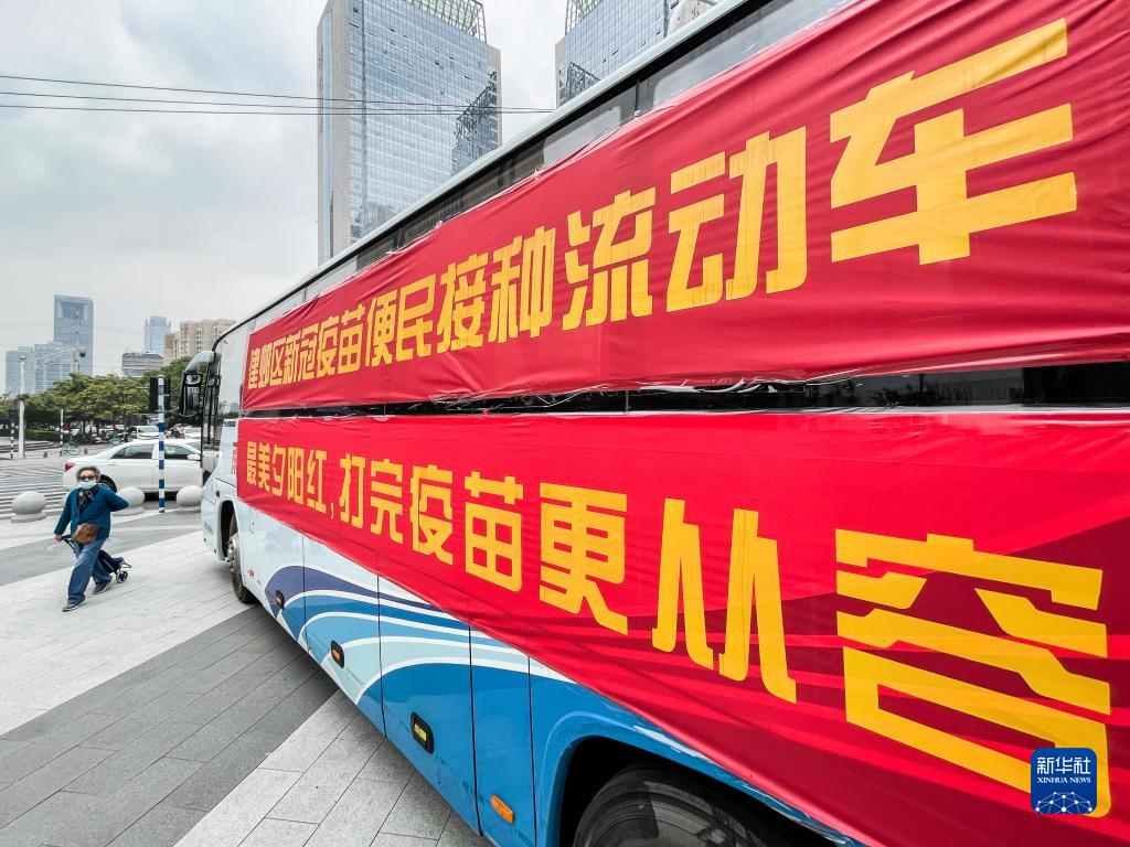 4月30日,在南京市建邺区,新冠疫苗便民接种流动车停在一处商业中心附近,方便市民接种疫苗。
