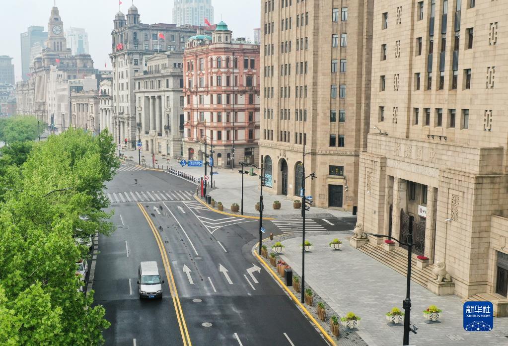 在后勤服务小组指挥下,一辆载有生活物资的配送车行驶到位于上海外滩中山东一路23号的中国银行上海市分行营业部附近,进行物资配送(4月21日摄,无人机照片)。