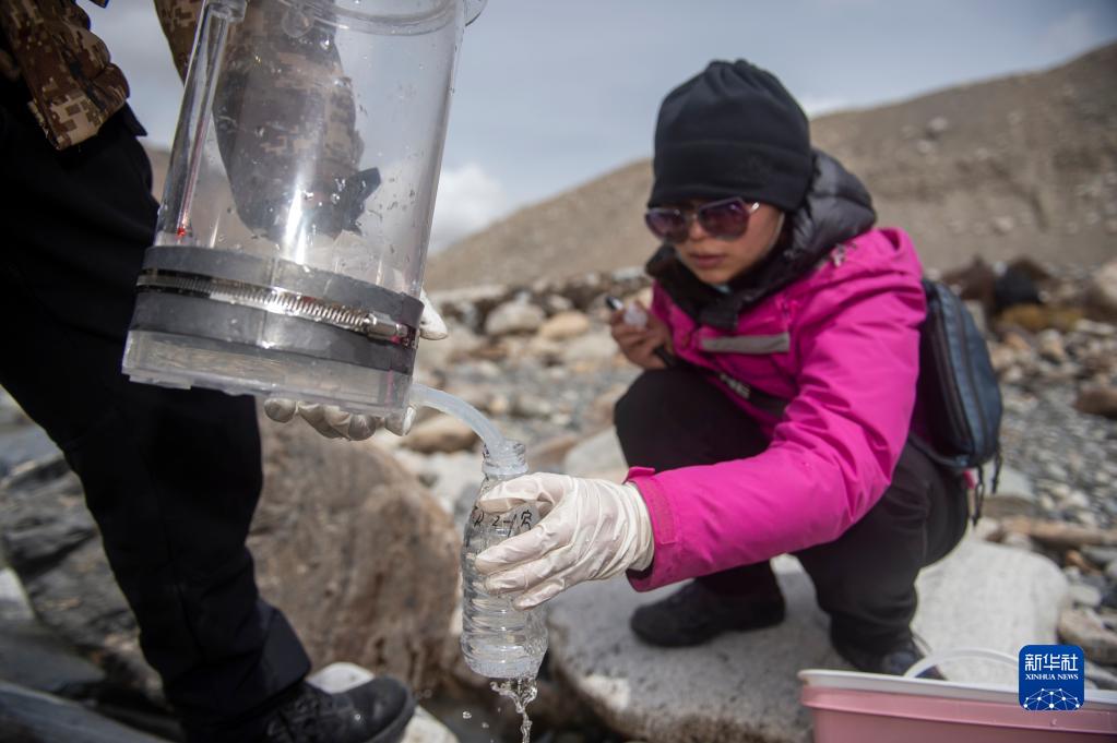 在东绒布冰川区域,科研人员进行微生物指标水样采集(4月30日摄)。