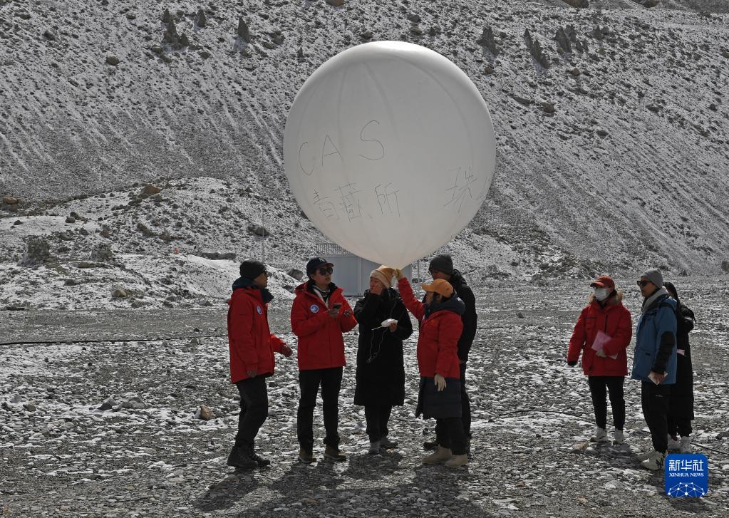 在珠峰登山大本营,科研人员放飞无线电探空气球(4月30日摄)。