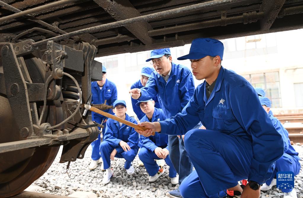 4月29日,在西安铁路职业技术学院,老师邵泽宽(右二)指导学生进行车辆单车检查实操。
