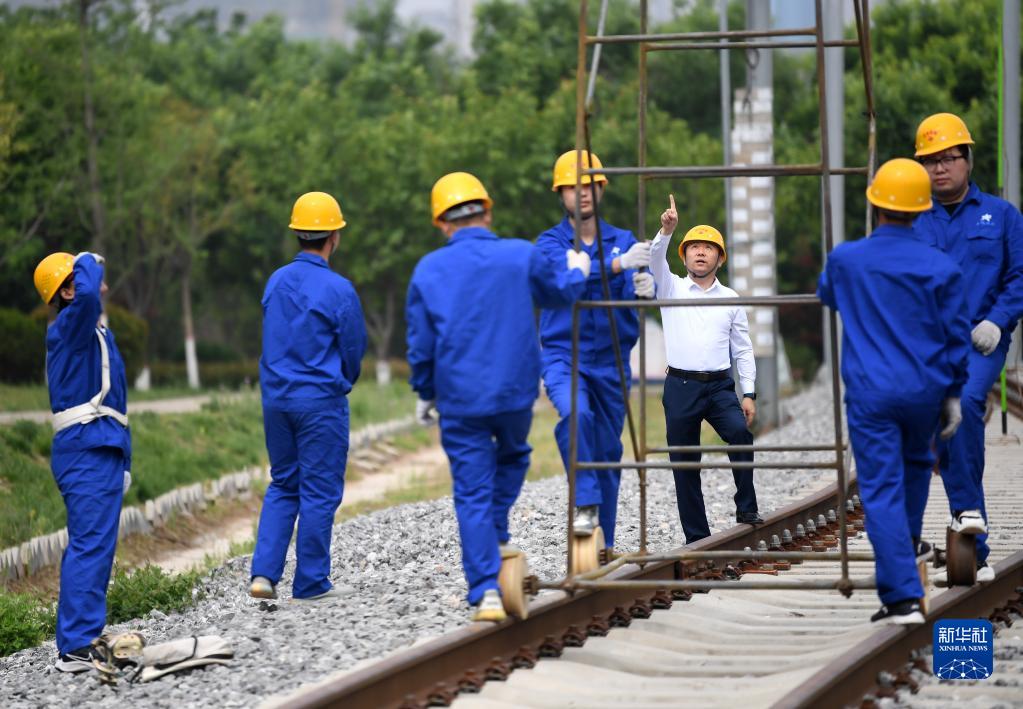 4月29日,在西安铁路职业技术学院,老师尚晶(右三)指导学生练习在接触网线上行走。