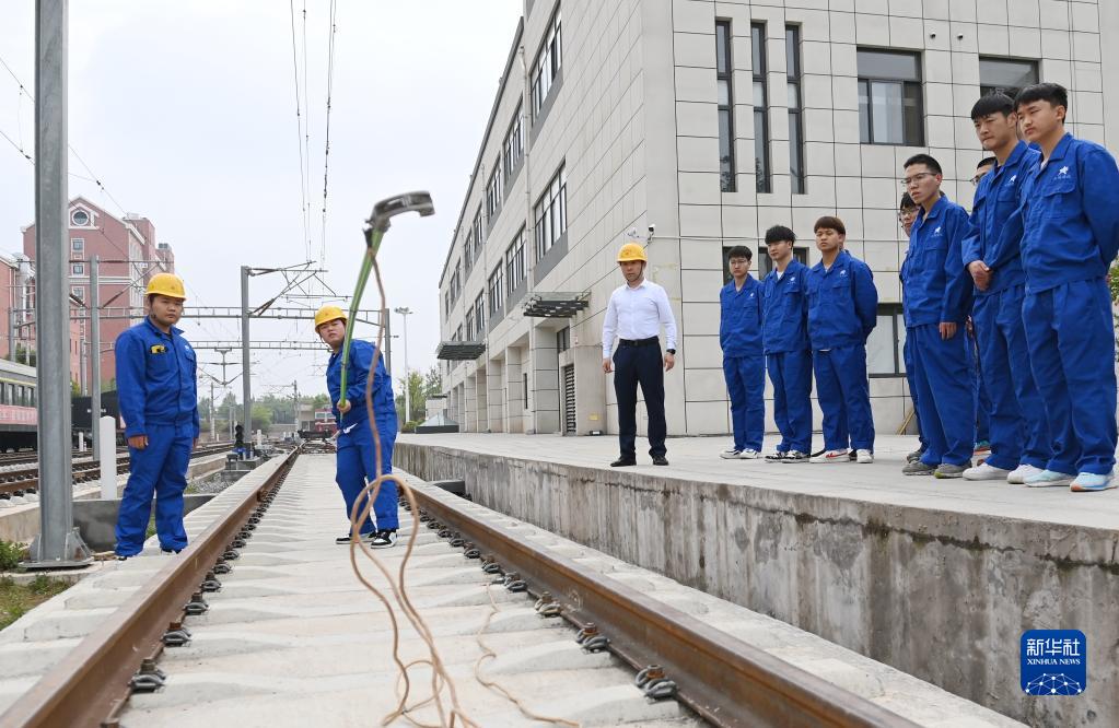 4月29日,在西安铁路职业技术学院,学生在课堂上进行接触网验电接地实操。