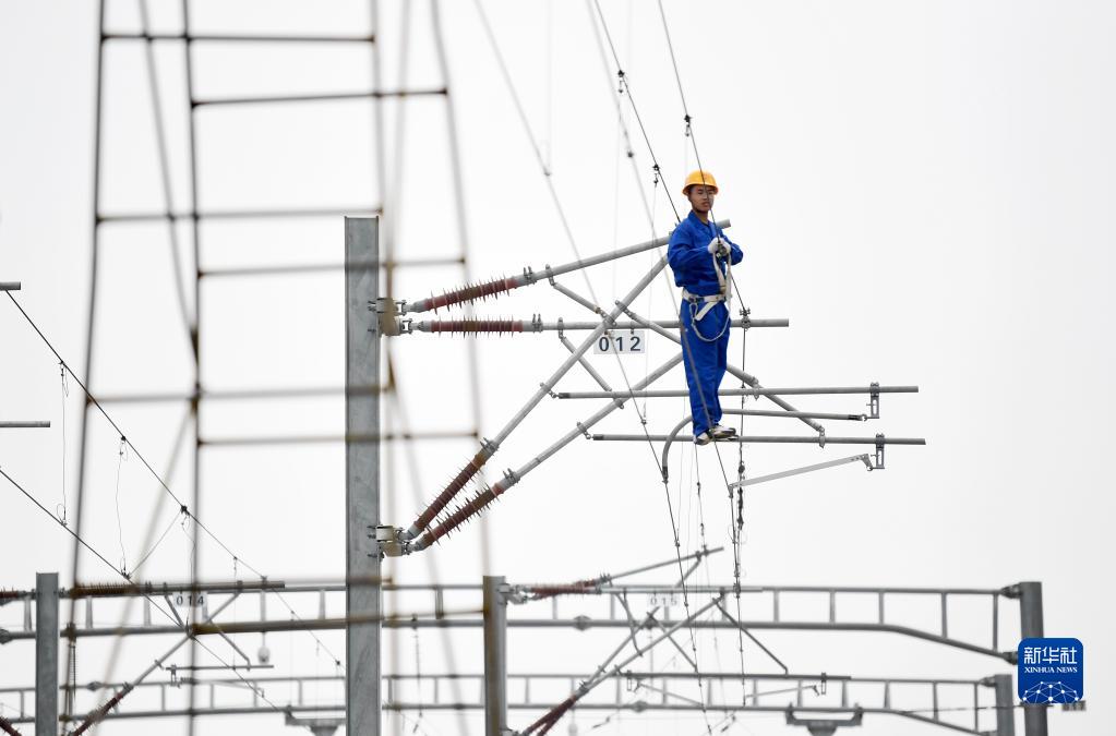 4月29日,在西安铁路职业技术学院,学生在课堂上练习在接触网线上行走。