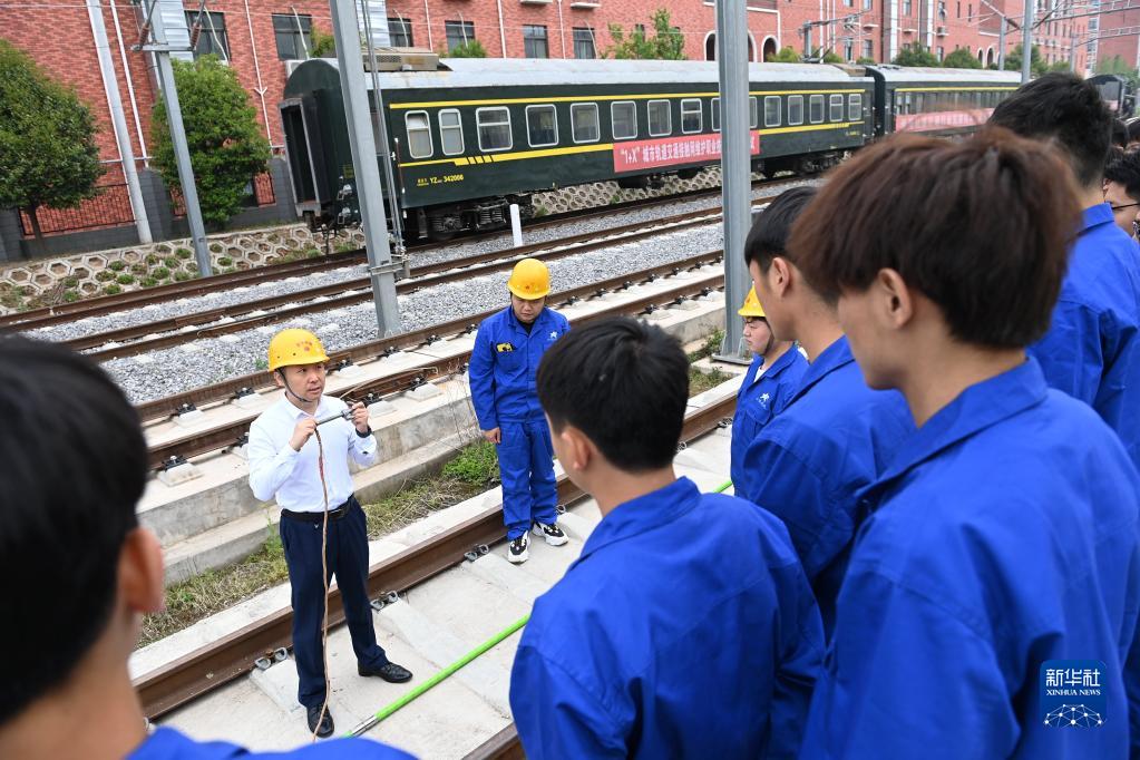 4月29日,在西安铁路职业技术学院,老师尚晶(后左)指导学生进行接触网验电接地实操。