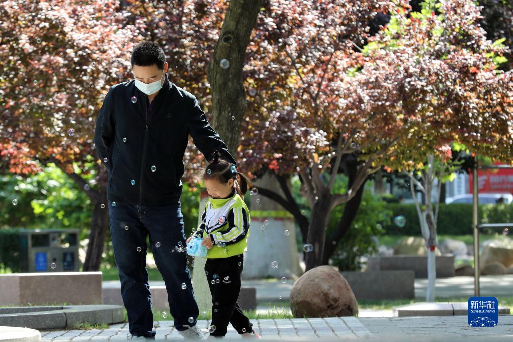 4月30日,市民带着小朋友在石家庄市人民广场休闲游玩。