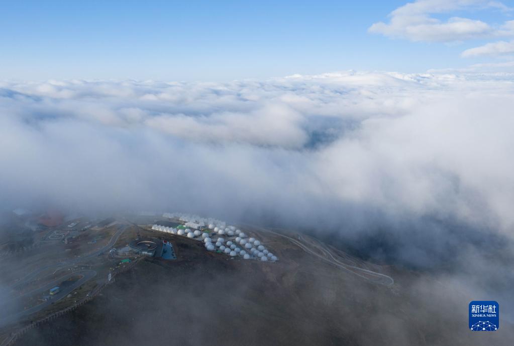 4月30日拍摄的地跨四川省荥经县和泸定县的牛背山山顶帐篷酒店一角(无人机照片)。从今年“五一”假期开始,四川牛背山景区面向游客开放。