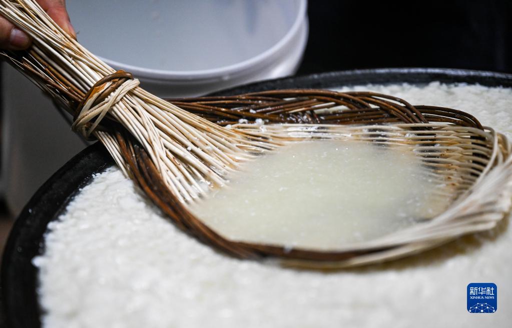 4月27日,在正蓝旗吉胡兰图嘎查,陶高用篦子滤掉乳清。