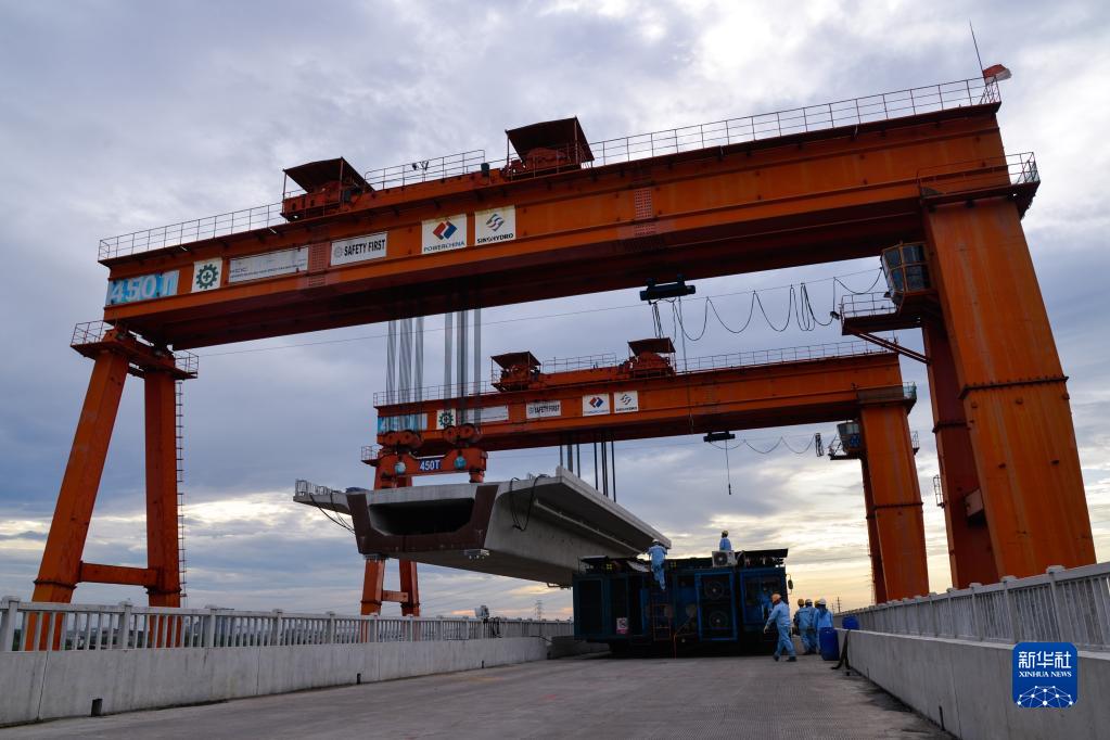 4月28日,工人在印度尼西亚雅万高铁2号特大桥上进行提梁作业。