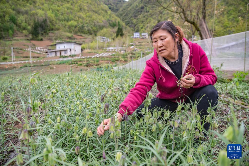 4月28日,在重庆市巫溪县兰英乡西安村,村民梁昌菊在自家种植的太白贝母田内除草。