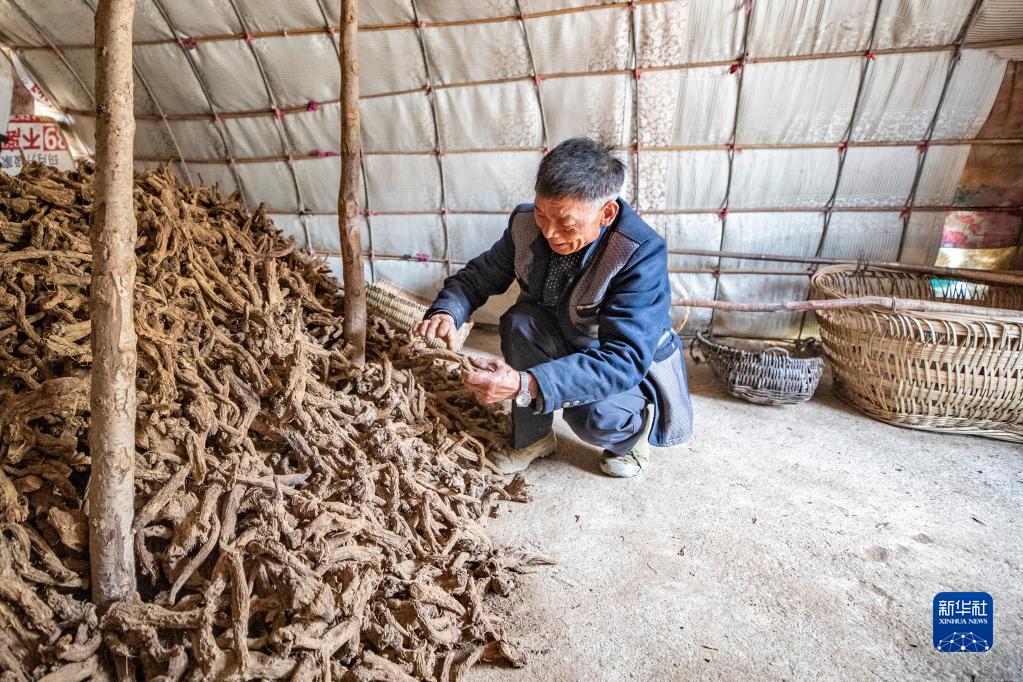 4月27日,在重庆市开州区关面乡泉秀村,药农彭贵宗在查看烘干后的木香。