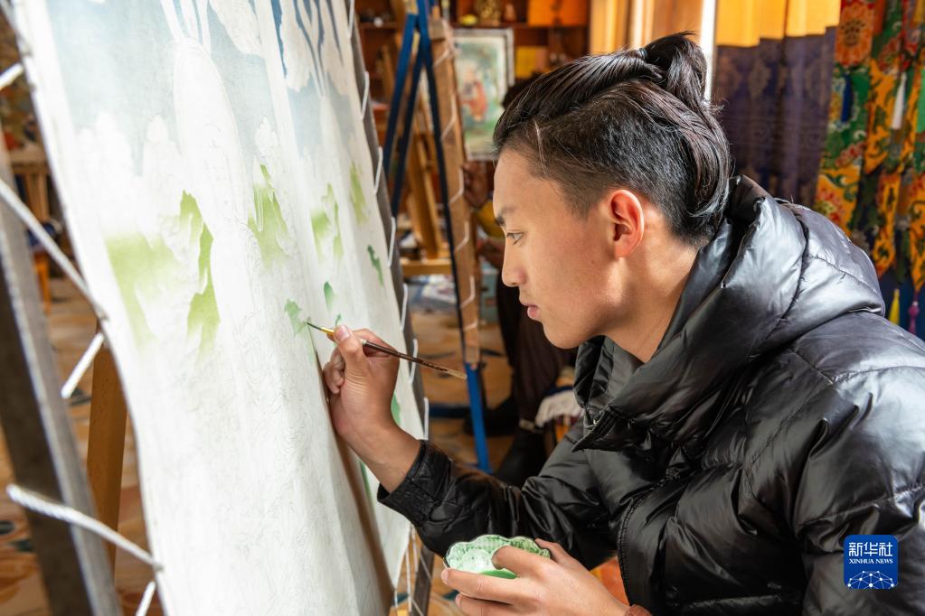 在昌都市察雅县的产业车间,唐卡画师在作画(4月8日摄)。