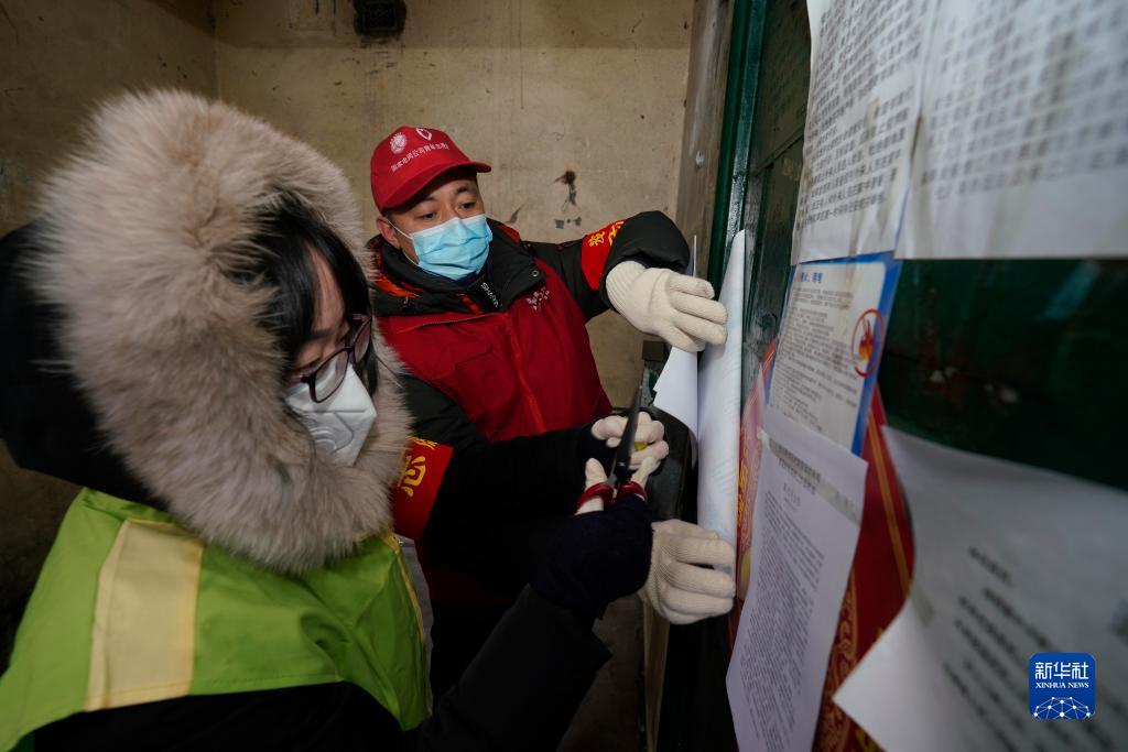 2020年2月14日,担任防疫志愿者的梅宏刚(右)在哈尔滨市一社区内粘贴防疫公告。