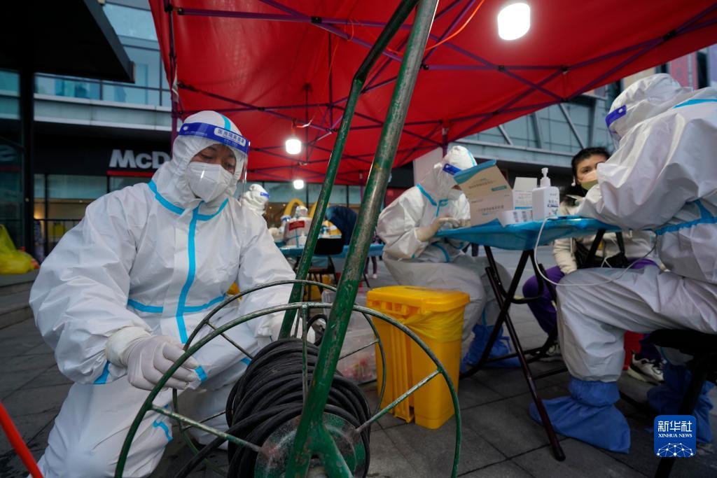 2021年9月26日,在哈尔滨市道里区,梅宏刚(左一)帮助一社区核酸采样点架设临时照明电源。