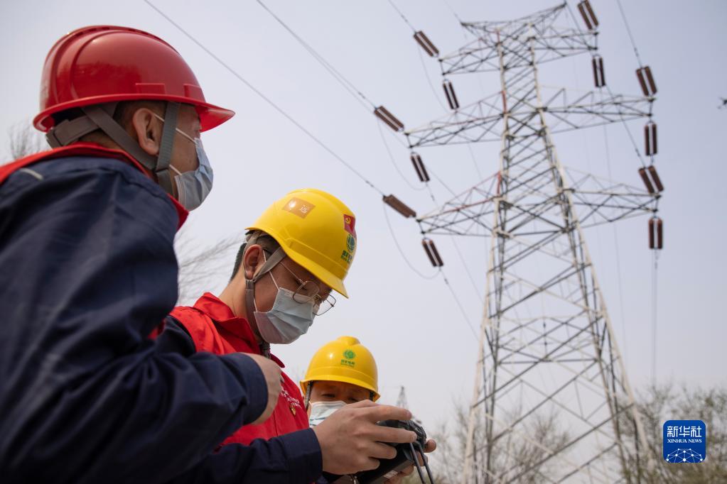 4月29日,梅宏刚(左一)与同事一起利用无人机对供电设备进行特殊巡检。