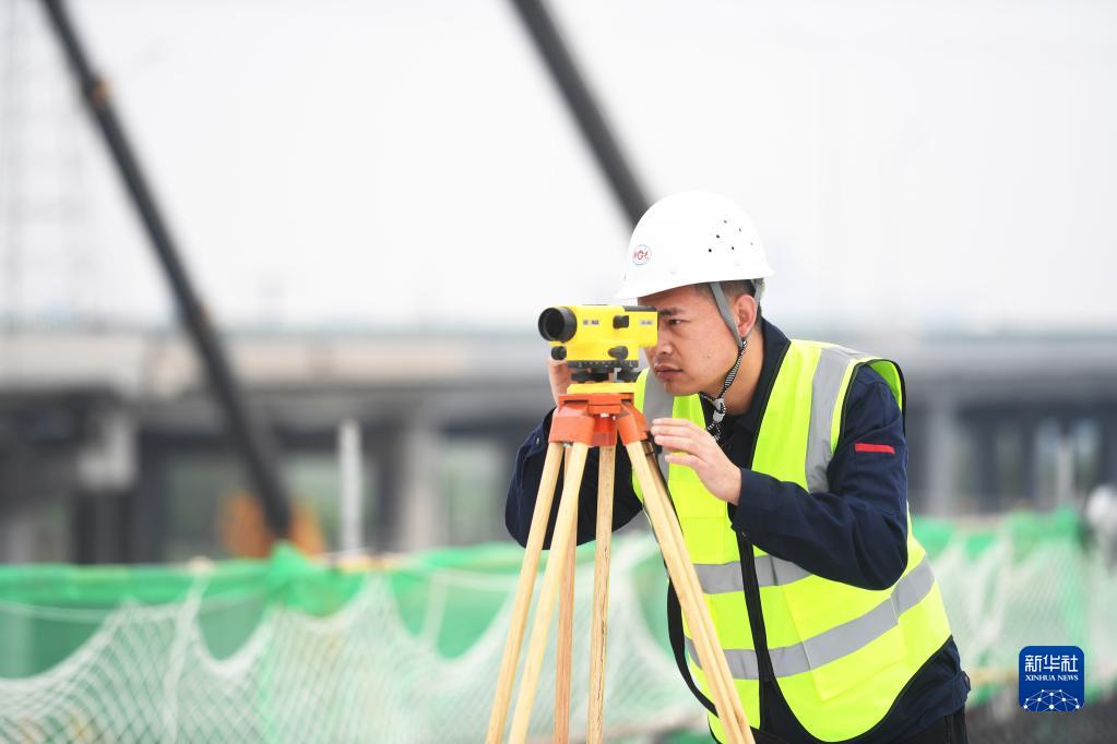 5月1日,中建路桥集团质检工人在河北石家庄复兴大街市政化改造建设工地进行质检作业。