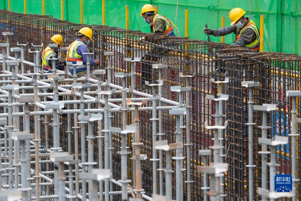 5月1日,中建三局三公司工人在湖北开放大学关山校区建设工地施工作业。