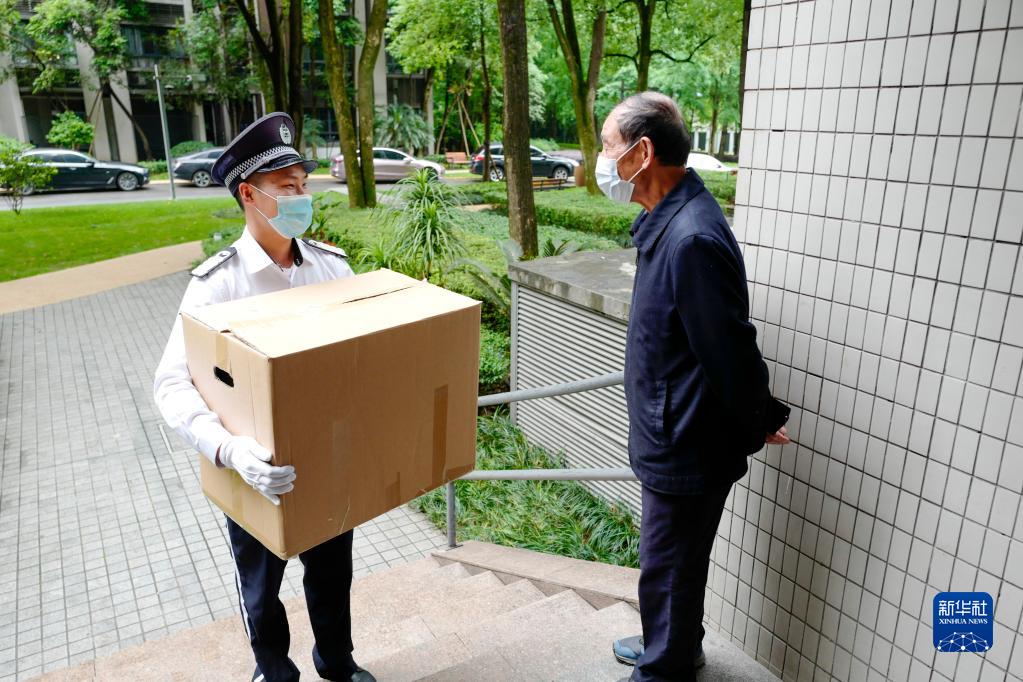 4月30日,李小刚在帮业主送代收包裹的路上和一位大爷打招呼。