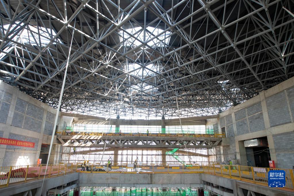 5月1日,工人在山西潇河国际会议中心建设现场施工。