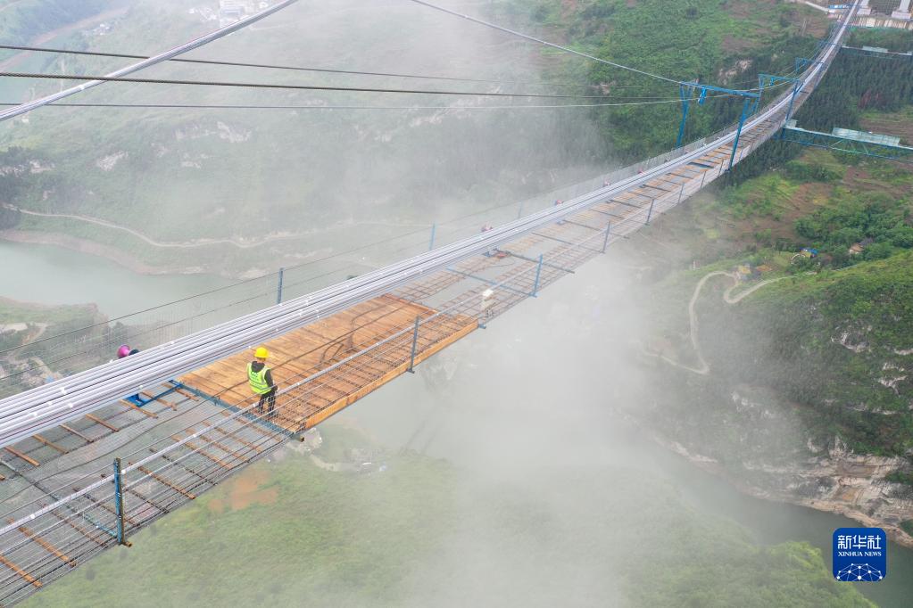 5月1日,工作人员在由中铁广州局承建的贵州金(金沙)仁(仁怀)桐(桐梓)高速桐梓河特大桥建设现场行走(无人机照片)。