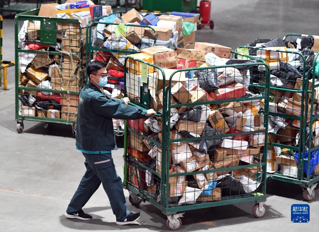 5月1日,在中国邮政速递物流郑州邮件处理中心,工作人员在运输笼车。