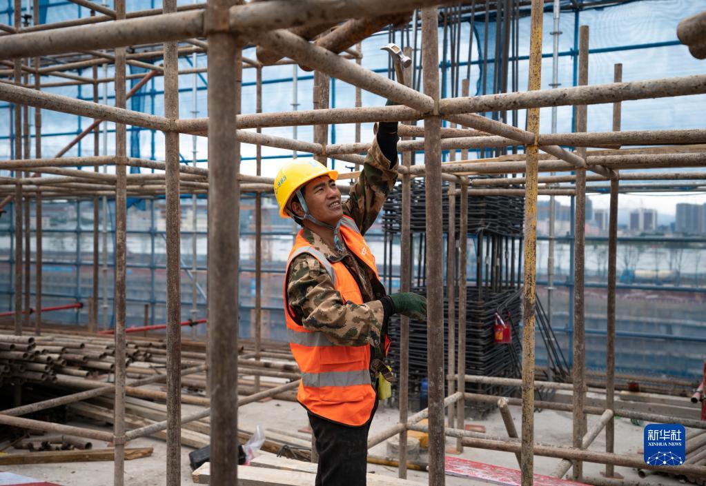 5月1日,在中建七局西南公司昆明斗南花卉小镇花卉产业综合配套服务区(一期)项目建设工地上,工人在固定脚手架。