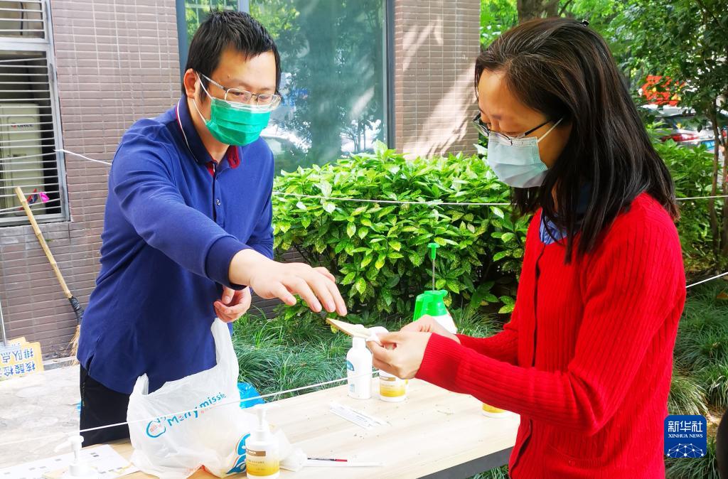 5月1日,上海市松江区九里亭街道奥园社区居委会工作人员(左)向居民发放临时出入通行证。