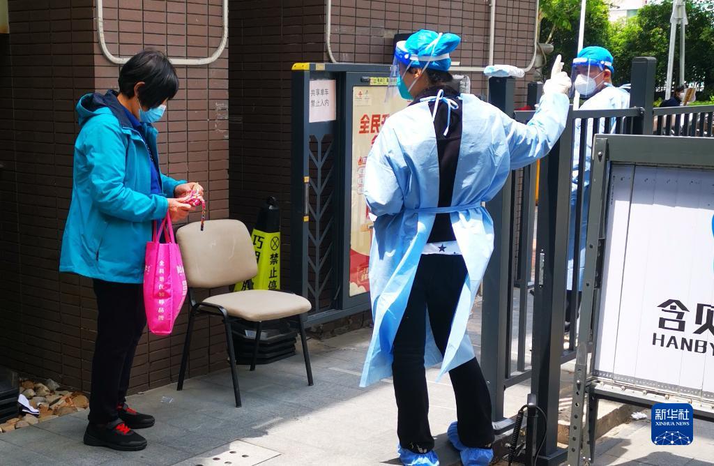 5月1日,一位奥园社区居民(左)在出小区时向工作人员出示临时出入通行证。
