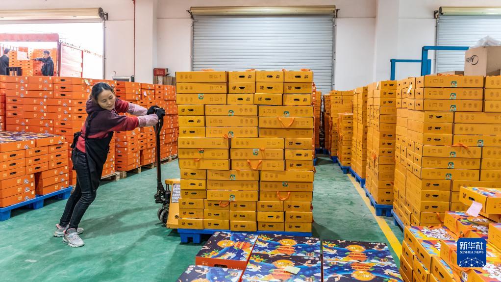 在广西融安蚂蚁农业发展有限公司云仓,工人在搬运装好箱的金桔(2021年11月22日摄)。