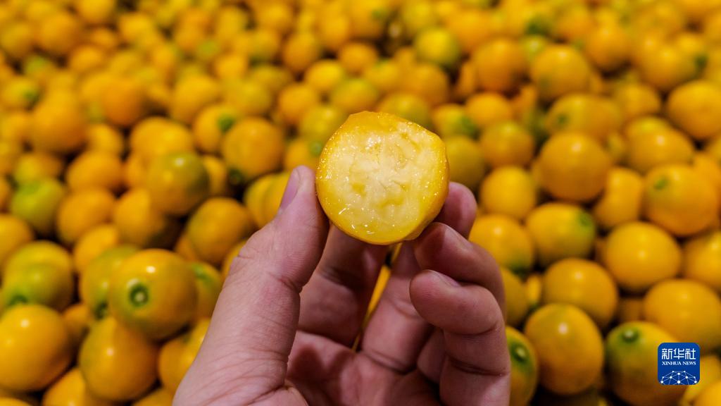 在广西融安蚂蚁农业发展有限公司云仓,韦小东在检查金桔质量(2021年12月27日摄)。