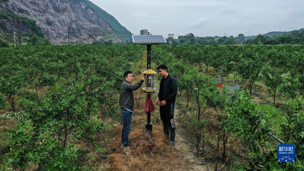 在融安县长安镇大坡村的“蚂蚁农业电商数字示范基地”,韦小东(左)和同事在检修灭虫灯(4月30日摄)。