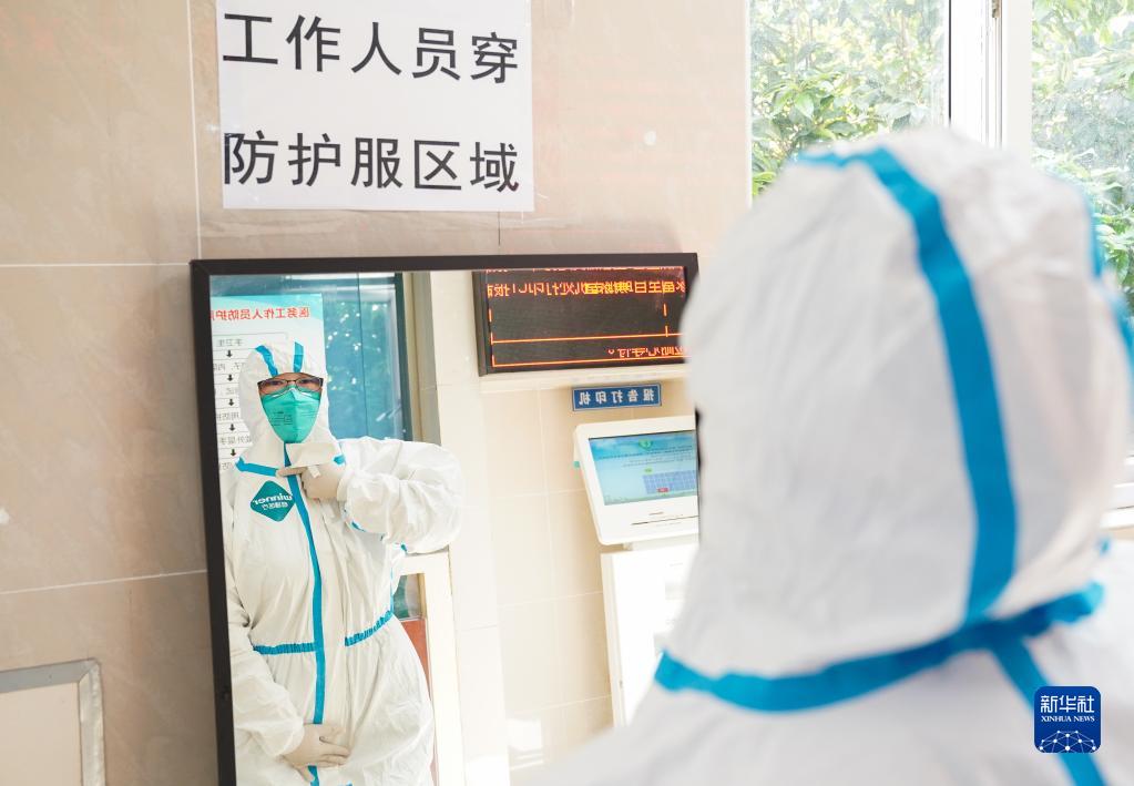 在上海市普陀区利群医院,吴颖在更衣区穿上防护服(4月30日摄)。