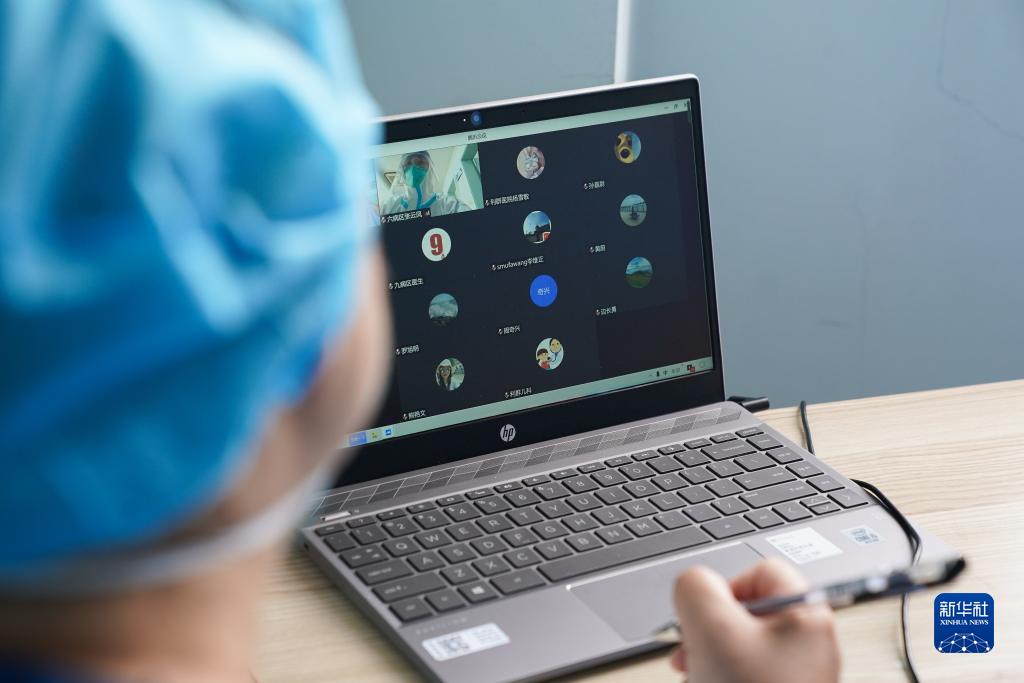 在上海市普陀区利群医院,吴颖在办公室开线上会议(4月30日摄)。