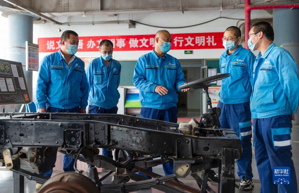 4月21日,在北京环卫集团,孙志宝(中)给同事们讲解汽车结构。