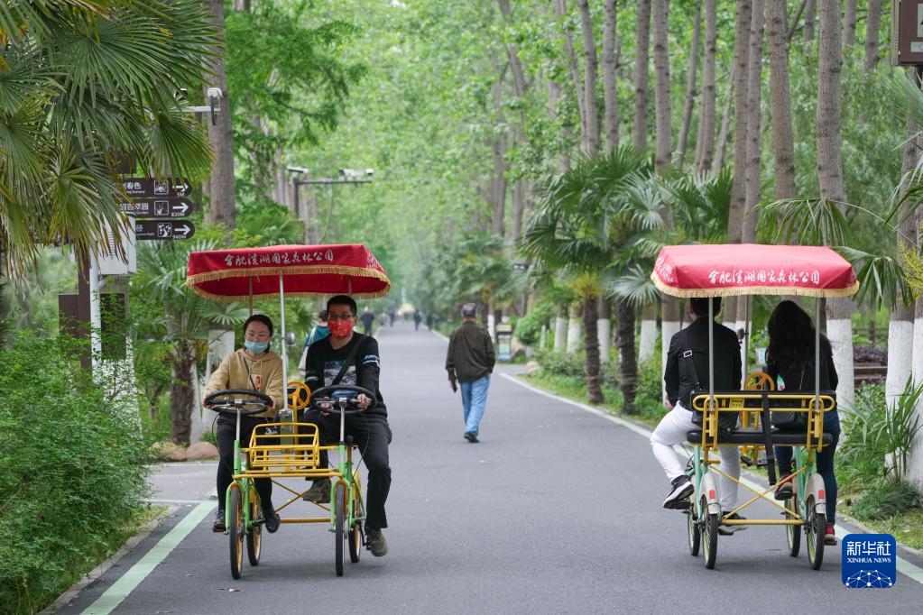5月1日,市民在安徽省合肥滨湖国家森林公园骑行游园。
