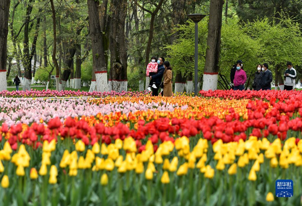 5月1日,市民在青海省西宁市人民公园内赏花。