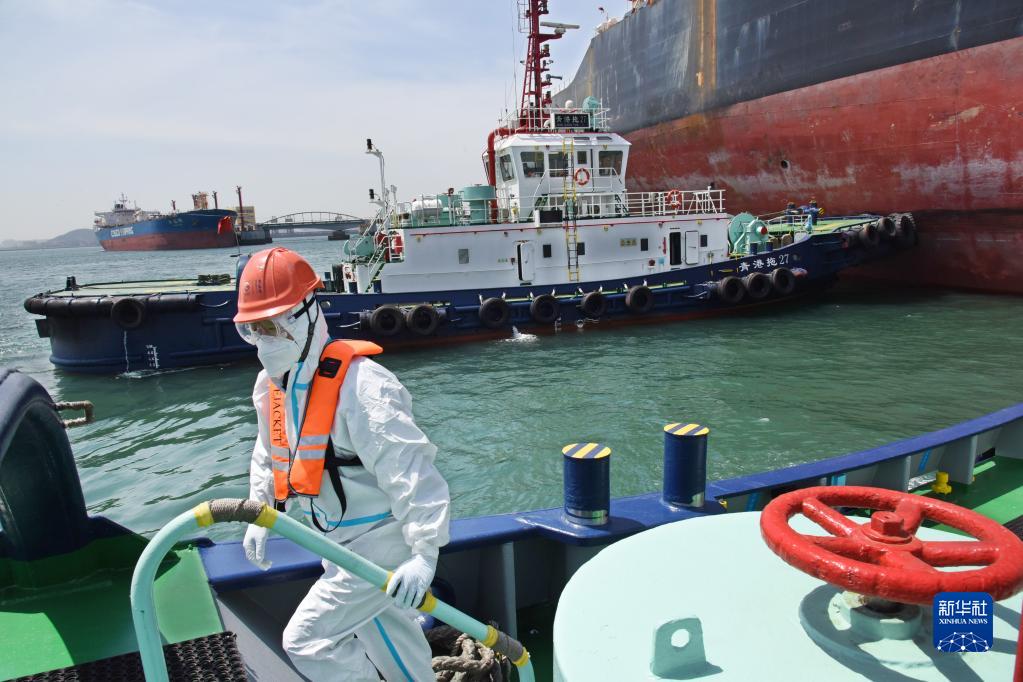 5月1日,在山东港口青岛港黄岛港区原油码头,拖轮协助油轮进港卸油。