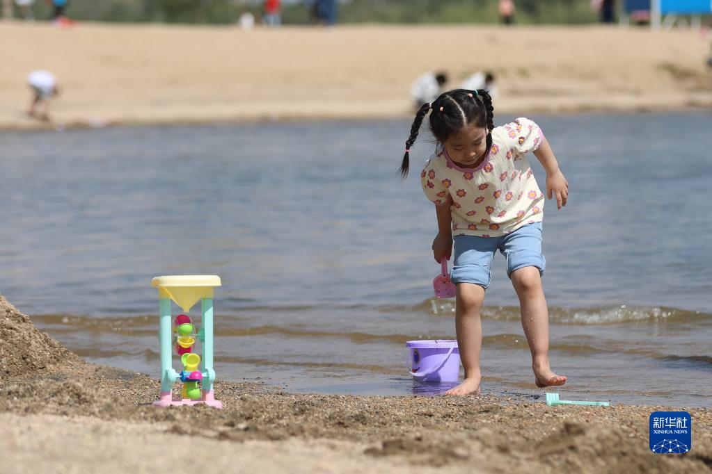 5月1日,小朋友在石家庄市行唐县东寺渔村旅游景区沙滩玩耍。新华社记者 骆学峰 摄
