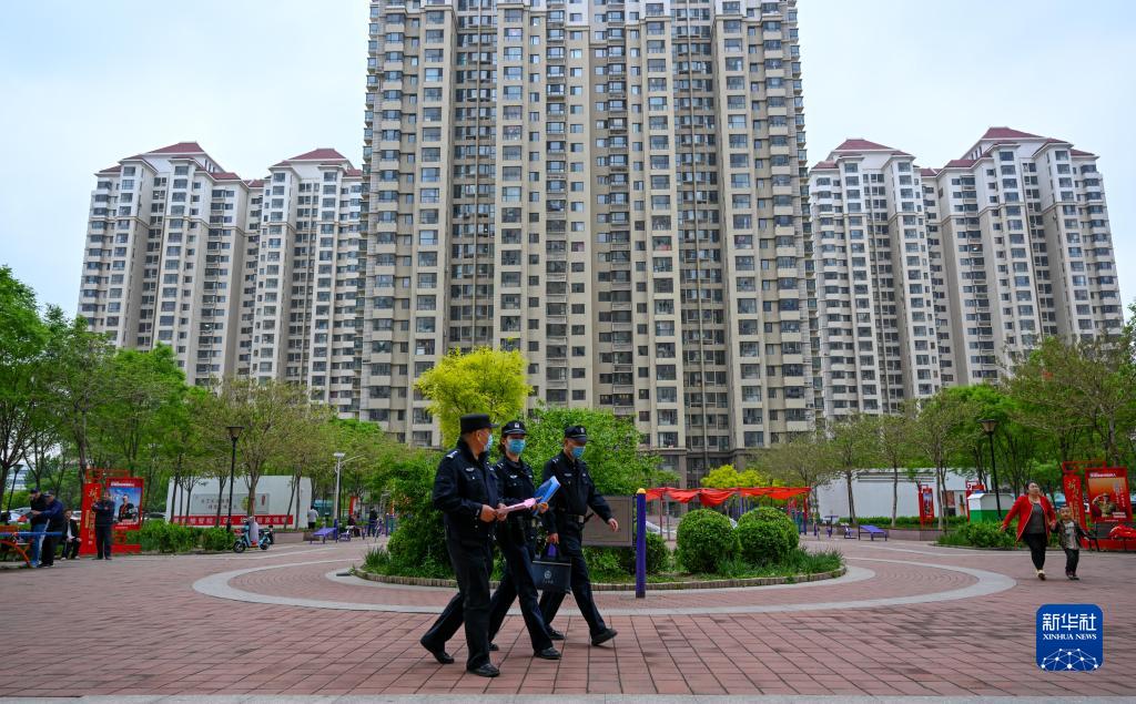 在天津市津南区林景家园社区,吕诗情(中)与民警王洪心(左)、辅警李兆辉在社区内巡逻(4月28日摄)。