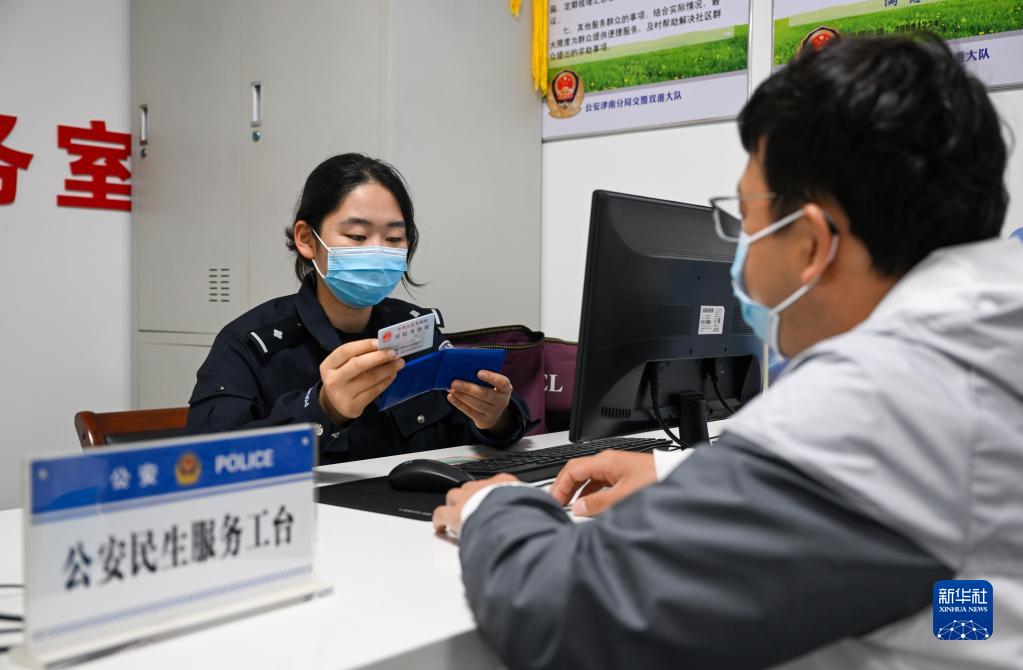 在天津市津南区林景家园社区,吕诗情在社区警务室内为社区居民办理车辆信息登记(4月28日摄)。