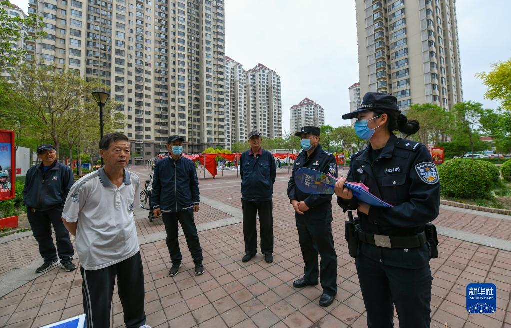 在天津市津南区林景家园社区,吕诗情(右一)和同事为居民普及防范电信诈骗知识(4月28日摄)。