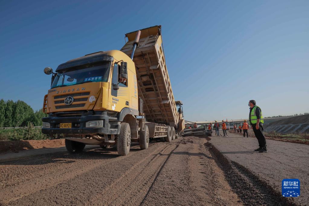 5月2日,工人在京秦高速(遵秦段)遵化市境内的互通枢纽建设工地施工。