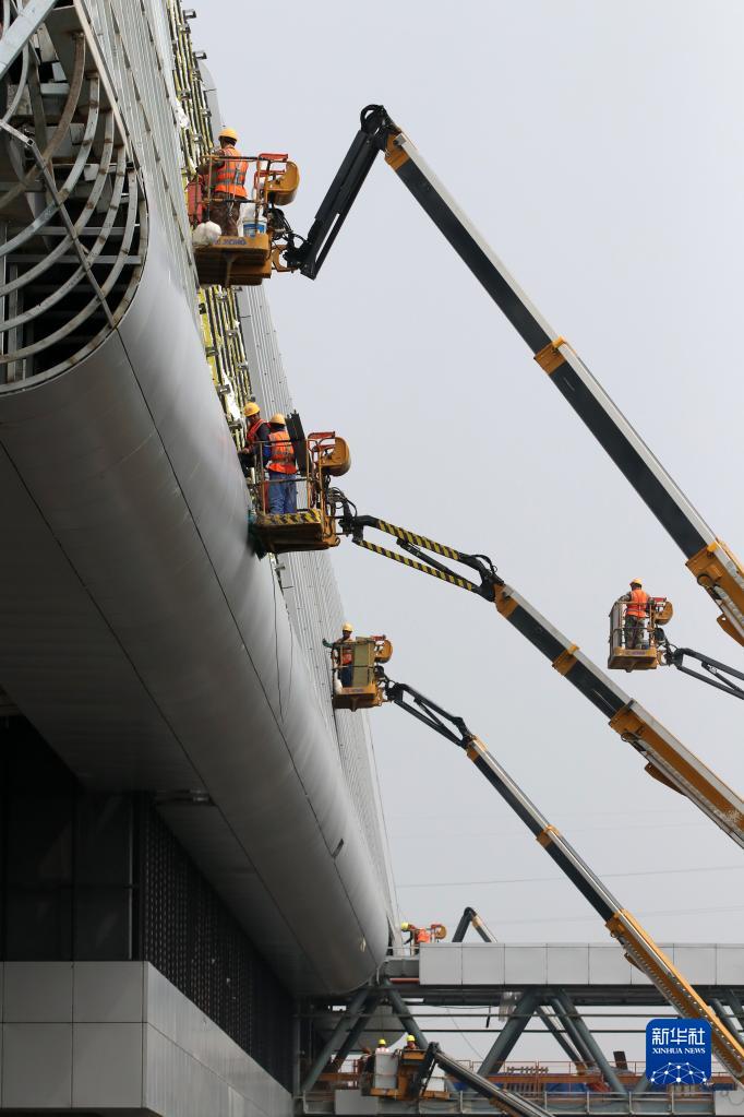 5月2日,在浙江台州市域铁路S1线温岭横峰站,建设者安装外墙装饰板。