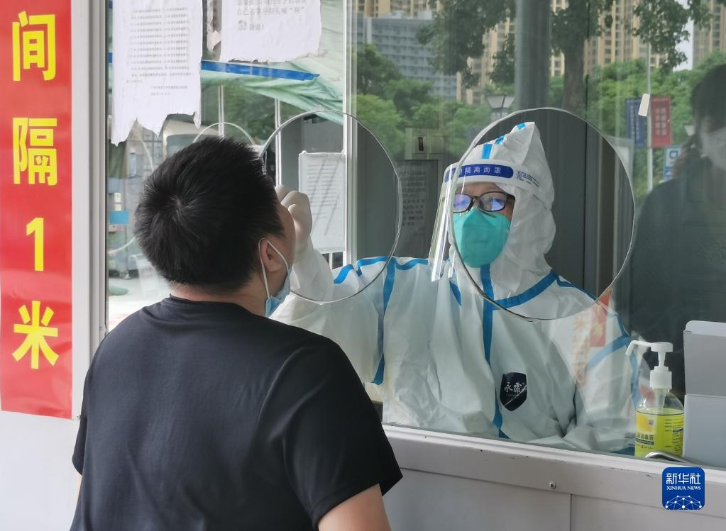 5月2日,在广西国际壮医医院核酸采样点,医务人员为市民进行核酸检测