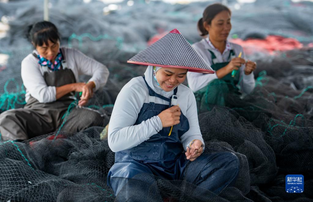 5月2日,在海南省琼海市潭门港,渔民在码头补网。