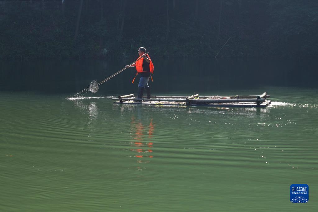 5月2日,在重庆市北碚区缙云山黛湖景点,北碚区澄江镇村民文亮在清理湖面落叶。