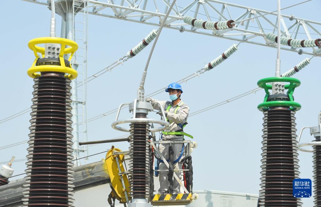 5月2日,在安徽省滁州市琅琊区220千伏林楼输变电工程建设工地,电力建设者在安装站内主电气设备。